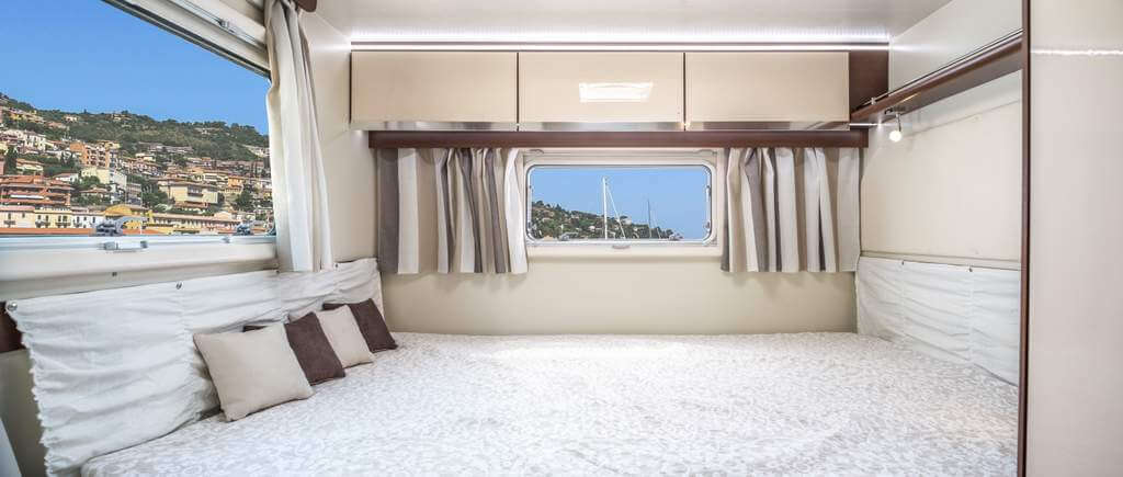 Der ALASKA TD zeichnet sich durch einen einzigartigen Grundriss aus. Er verfügt über ein 1,50m breites Hochbett, das optional höhenverstellbar ist und somit entweder eine hohe Garage (Fahrräder und Motorroller lassen sich gut verstauen) oder einen niedrigen Betteinstieg bietet. Im Schlafbereich ist so besonders viel Platz und auch ein hoher Kleiderschrank steht zur Verfügung. Ein bequemer Zugang zum Bett ergibt sich auch durch den Freiraum zwischen Bett zur Dusche.