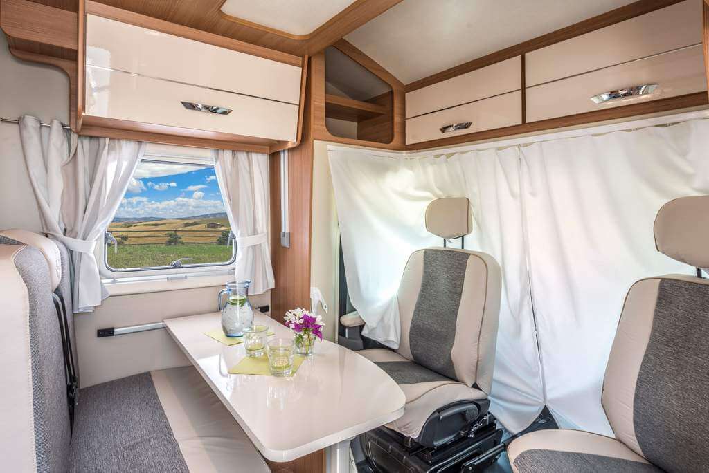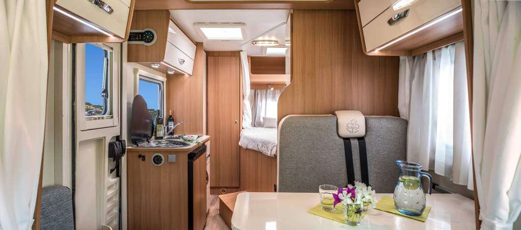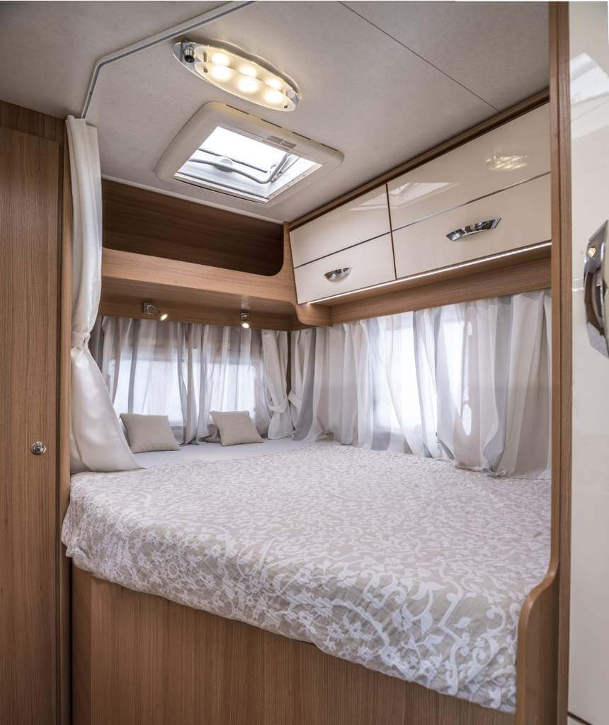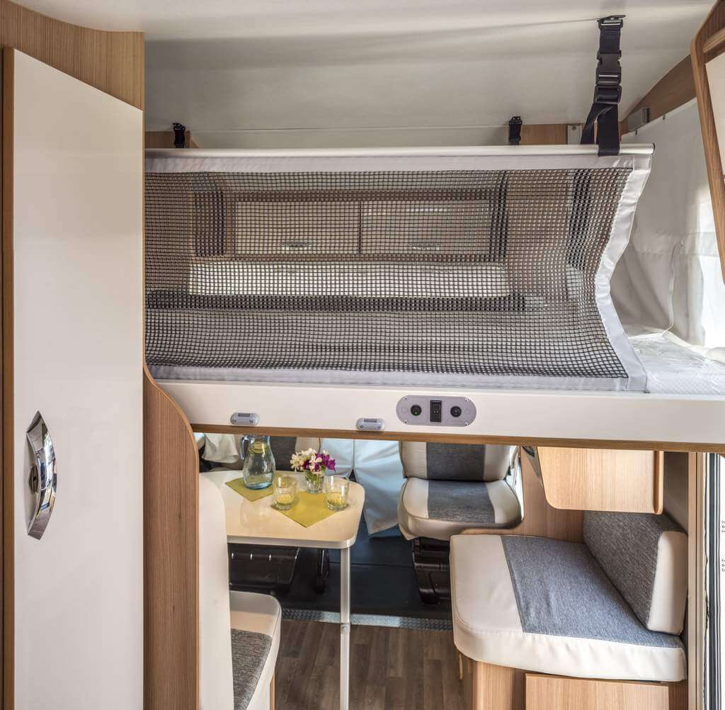 GFK Goden-Wände-Dach, serienmäßige Lattenroste und die neuen ergonomischen Ahorn Polster. Mit 5,99m ist der ACT 590 direkte Konkurrenz zum Kastenwagen. Allerdings hat man trotzdem die räumlichen Vorzüge von einem richtigen Reisemobil.