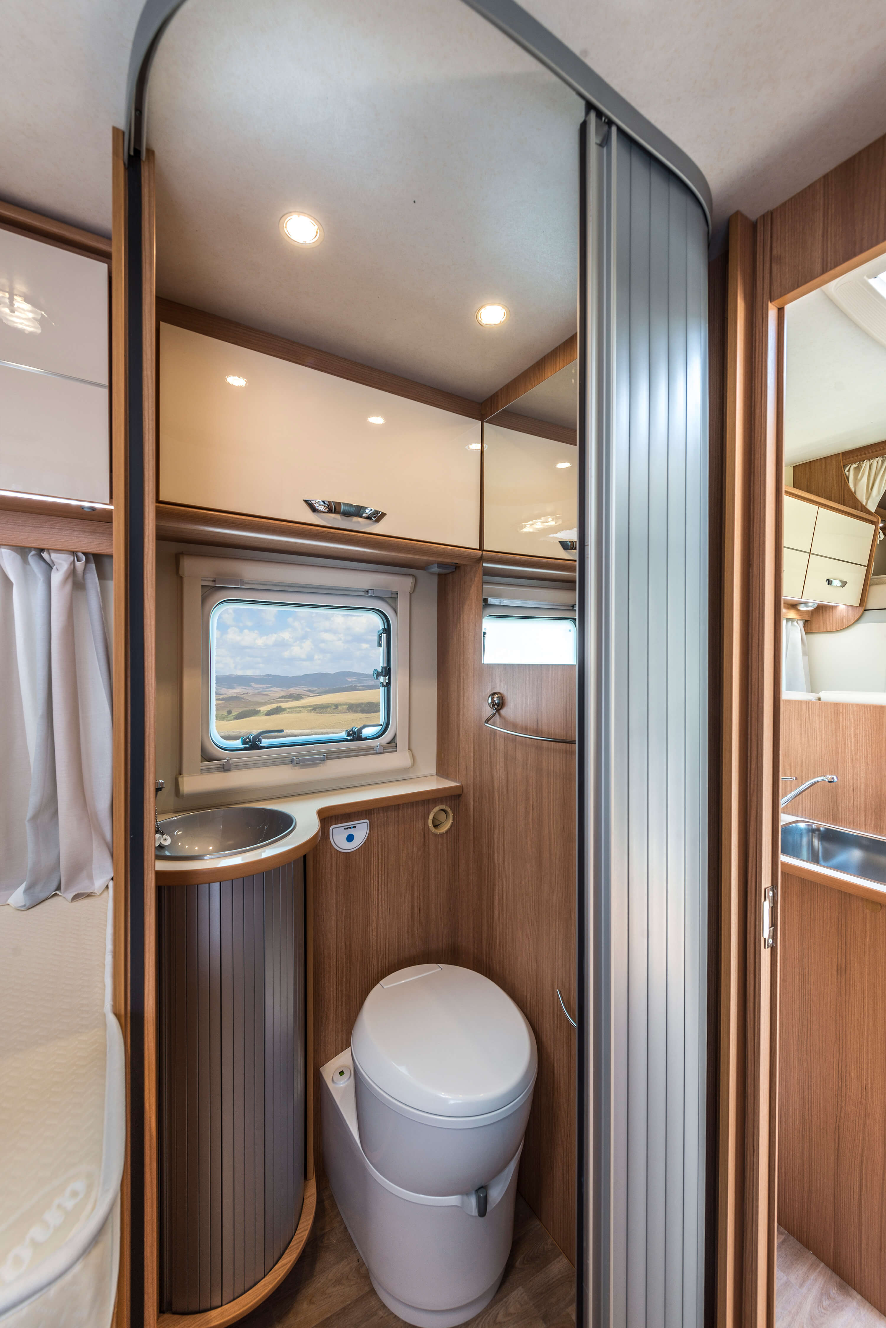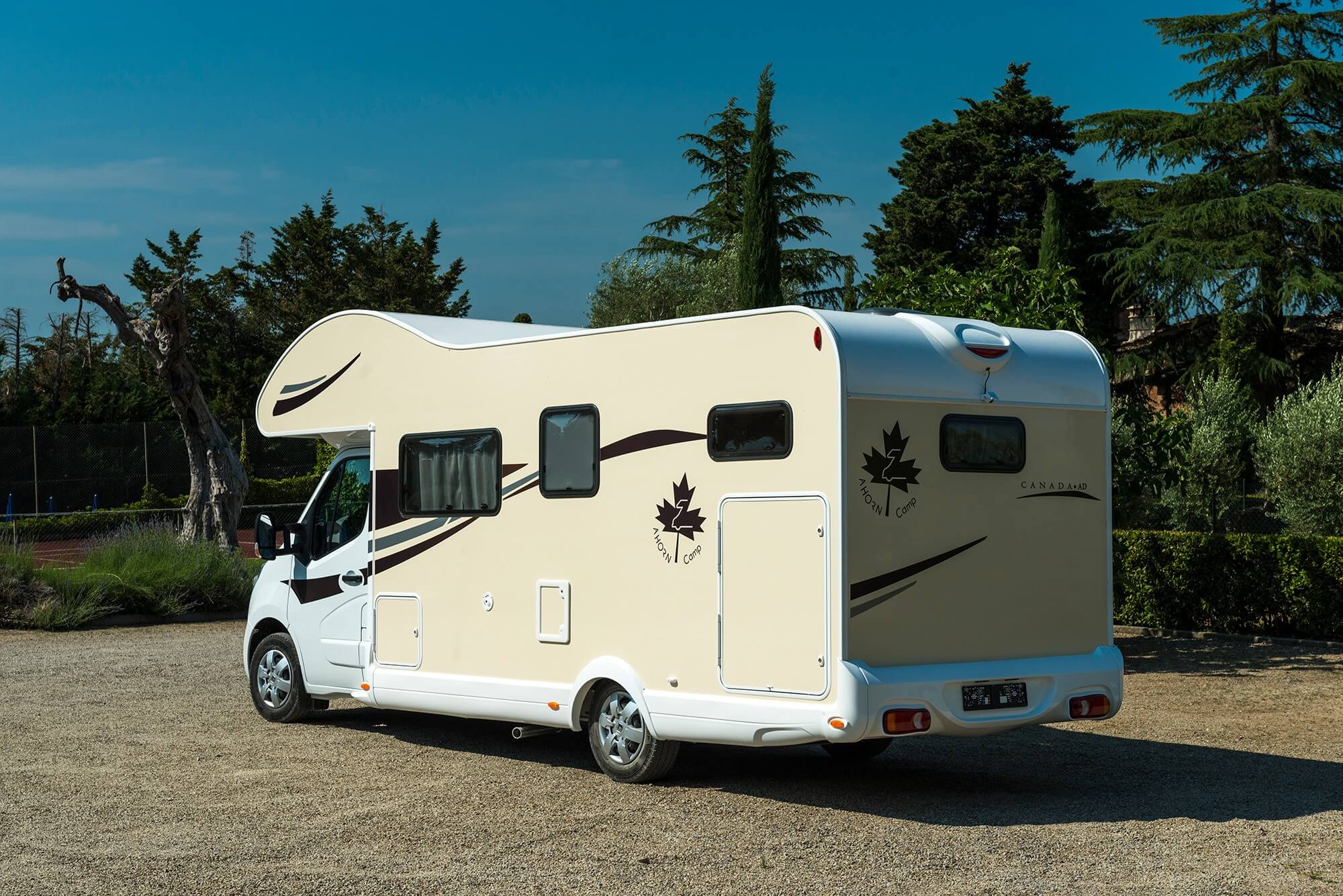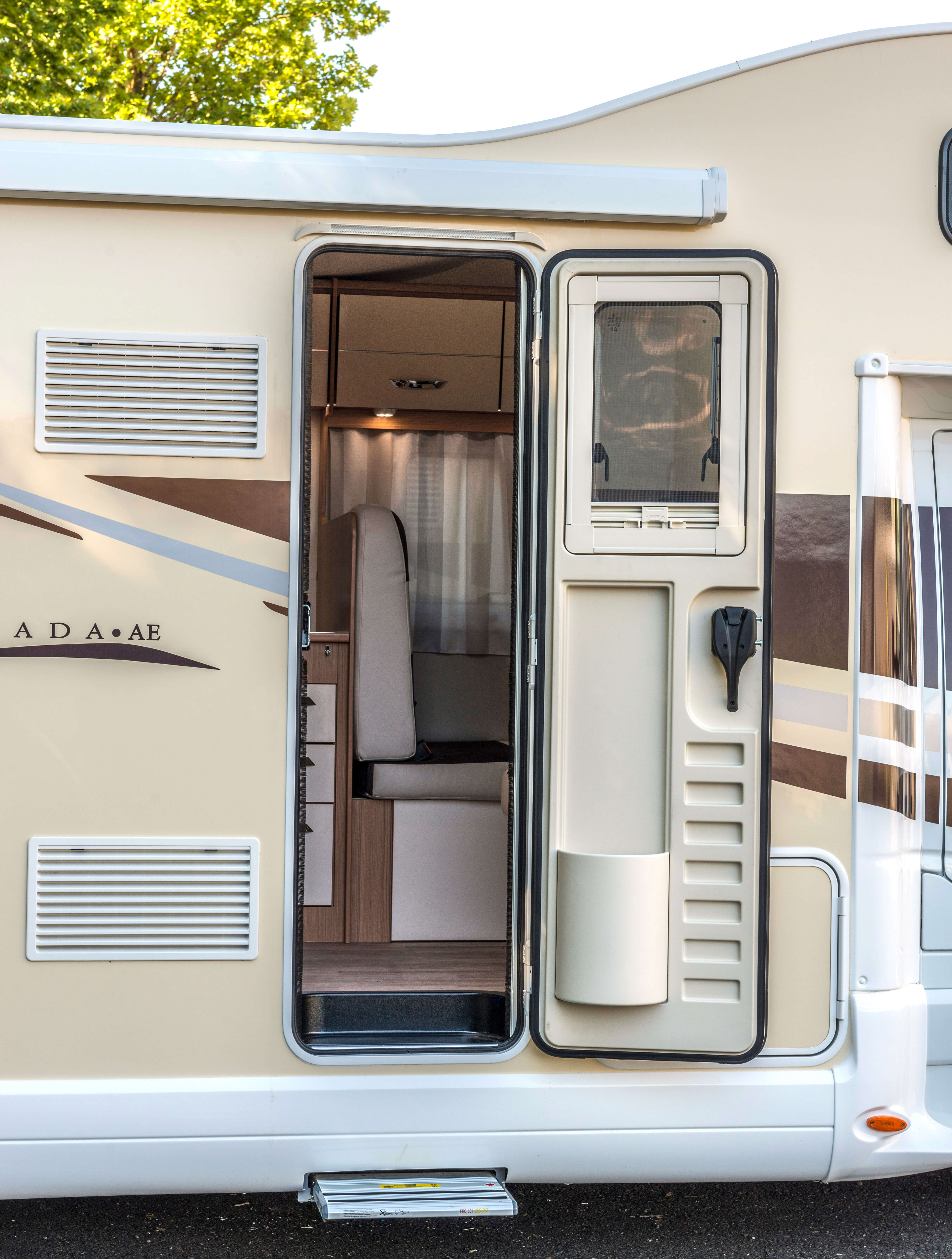 Der Canada AE ist für 5 Personen zugelassen und auch dafür ausgelegt. Die Dinette kann zum weiteren Bett umgebaut werden. Er verfügt über zwei abtrennbare Räume: Das Heck-Schlafzimmer mit integriertem Raumbad und der Wohnbereich mit Alkoven im Frontbereich.